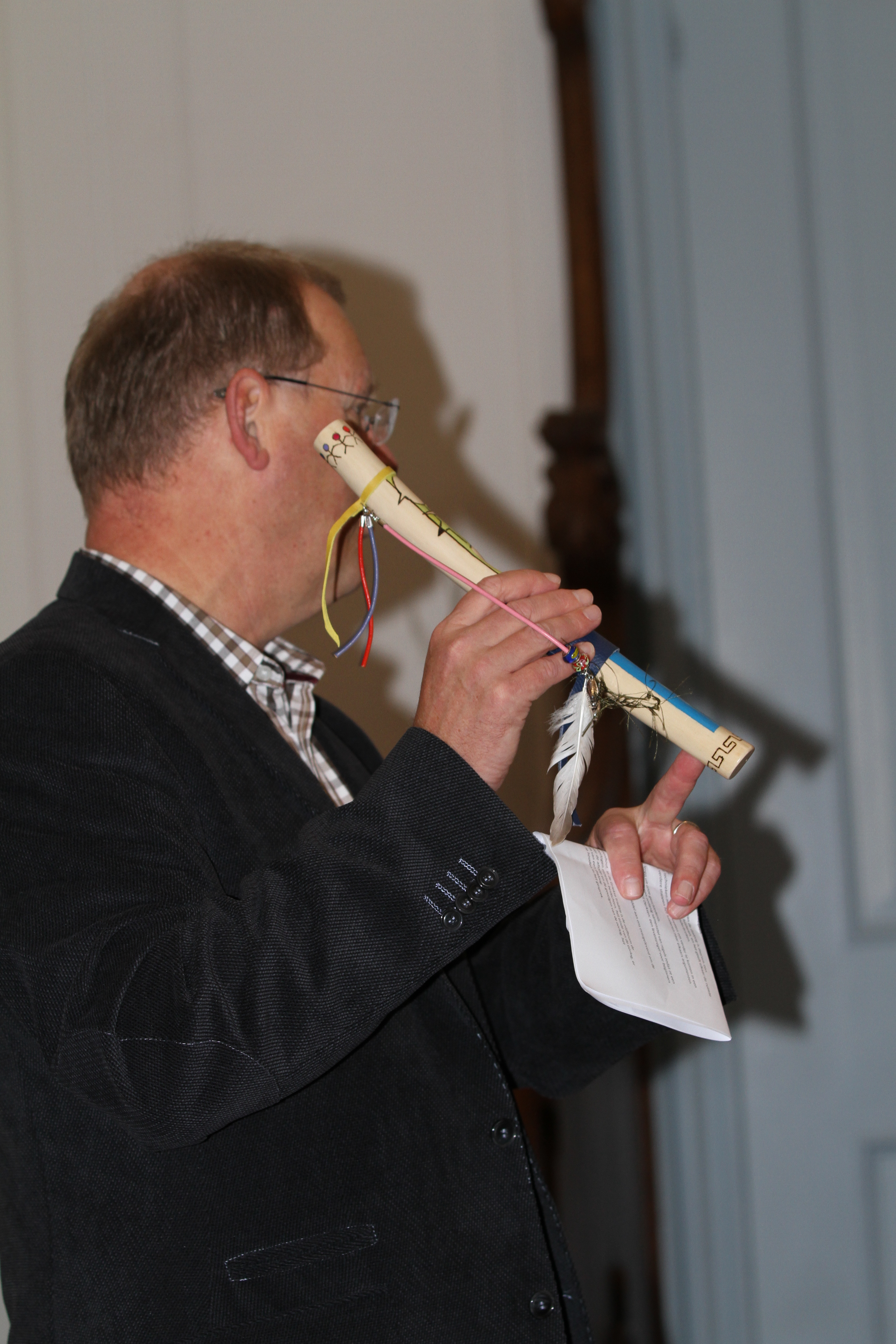 Sjef Lommen, directeur van de Pontes Pieter Zeemanschool uit Zierikzee, opende de Dag van de Dialoog en vertelde over de betekenis van de talking stick en haar symbolen.