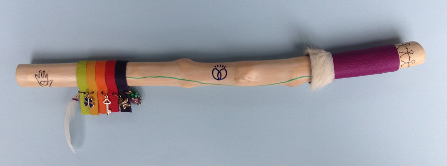 Een talking stick met alle persoonlijke wensen en symbolen van de eigenaar/organisatie, kernwaarden, exacte bedrijfskleuren en logo: vanaf € 450,- Iedere gewenste lengte tussen de 30 en 60 cm.