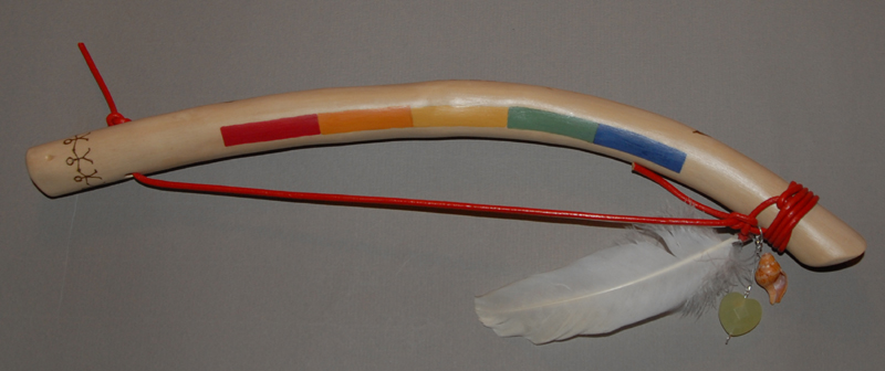 Een talking stick van olijfhout van 30-40 cm. met 5 symbolen en 2/3 kleuren kost: € 250,-
