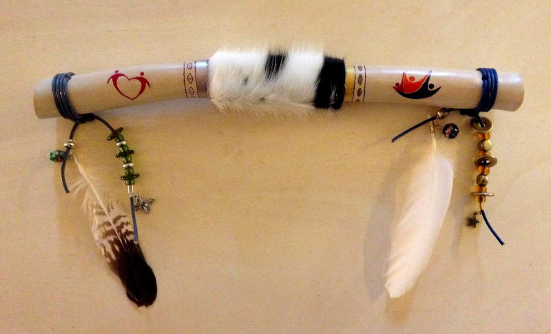 Een talking stick met de exacte bedrijfskleuren, logo en 5 kernwaarden verbeeld in symbolen, bedels, veren of kralen kost € 350,-