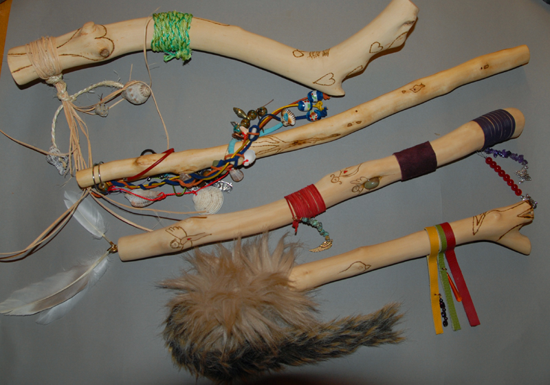 ‘s Morgens beschilder je de stok en kun je er symbolen inbranden. In de middag versier je de stok met attributen.